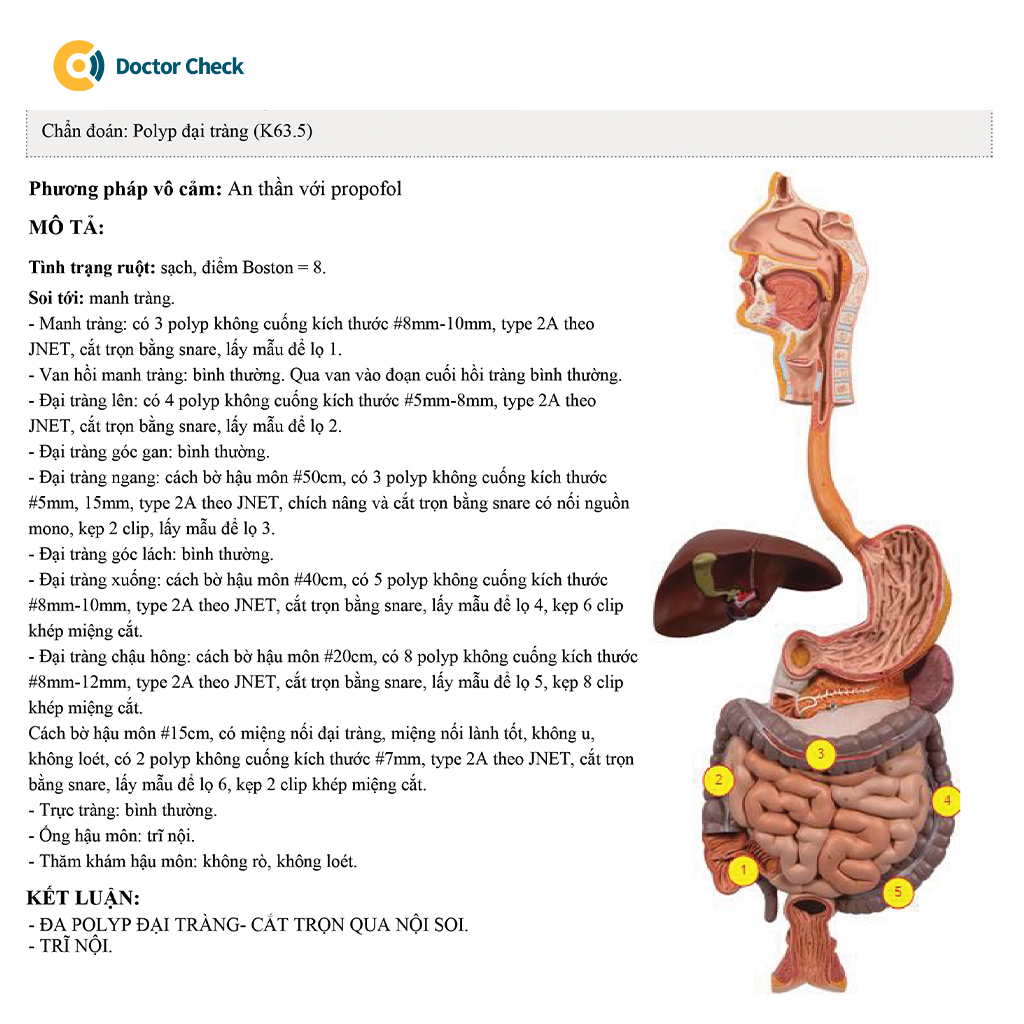 Trong lần tầm soát này, anh Đ. đã thực hiện nội soi đại trực tràng – một thủ thuật y khoa quan trọng để kiểm tra và phát hiện các khối polyp hoặc dấu hiệu ung thư. Kết quả tầm soát cho thấy anh có đến 25 polyp trong đại tràng, một con số đáng kể. Các bác sĩ tại Doctor Check đã nhanh chóng can thiệp, cắt bỏ toàn bộ các polyp này ngay trong quá trình nội soi.